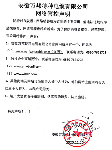 鄭重聲明:安徽萬邦特種電纜有限公司官方網站為:www_wanbangcable_com.sai-t.com,除此之外無任何子網站或合作網站,其余均為假冒偽劣。電話:0550-7621728 13485756353 地 址:安徽省天長市滁州高新技術產業開發區經四路29號
